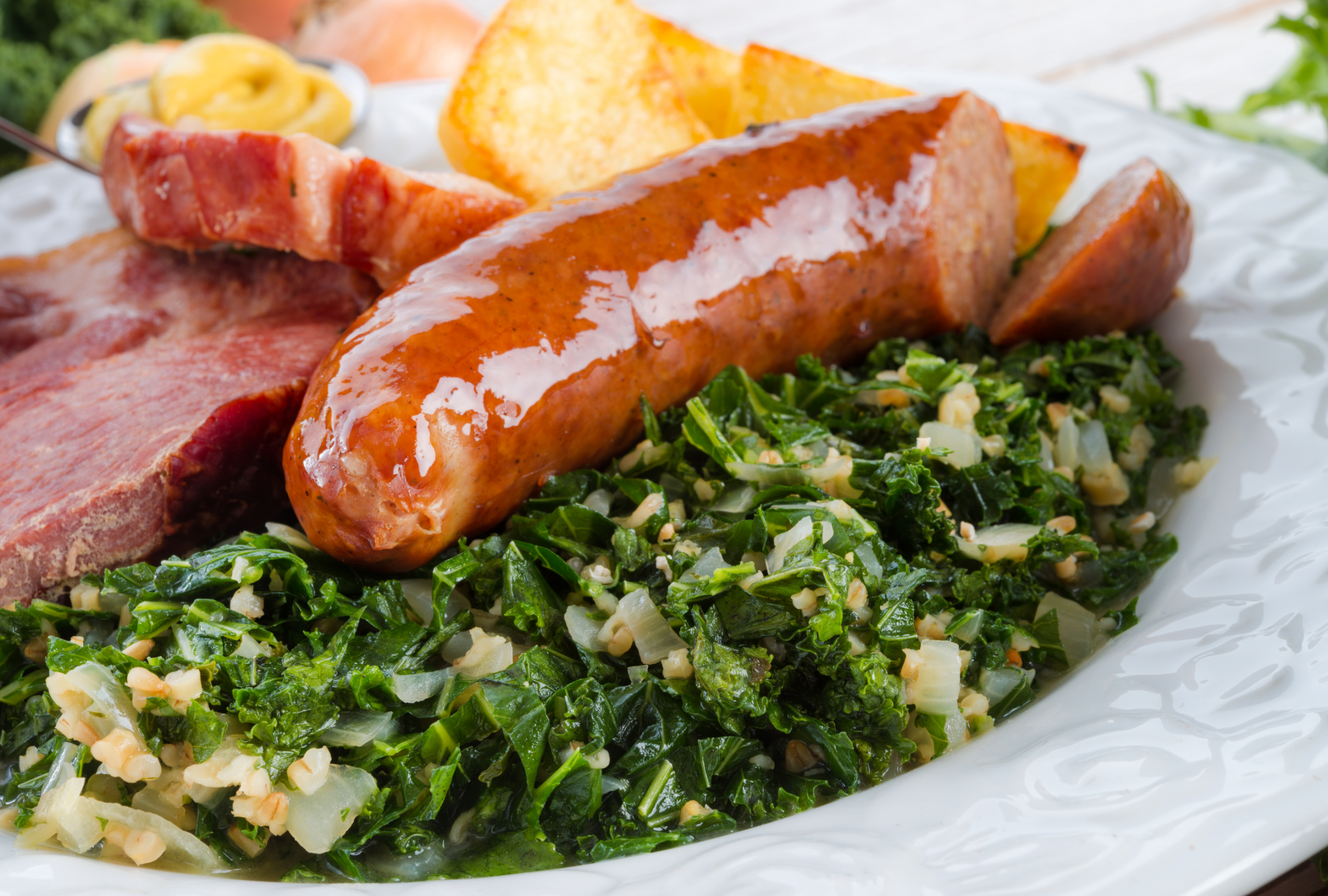 Herzhaftes Buffet mit Kohlwurst, Kasselernacken und Bauchspeck, dazu süße Kartoffeln, Salz- und Bratkartoffeln sowie Senf.